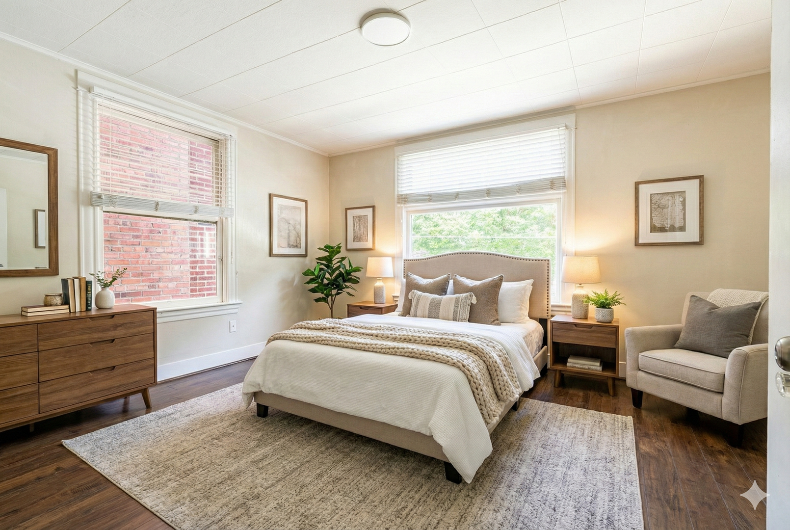 The apartment is a spacious with a full kitchen, sink, and large closet. A recent remodel left the classic hardwood floors in place but upgraded all the cabinetry and finishes leading to a lovely combination of old and new. It is a corner unit with views onto the street and into the side yard.
