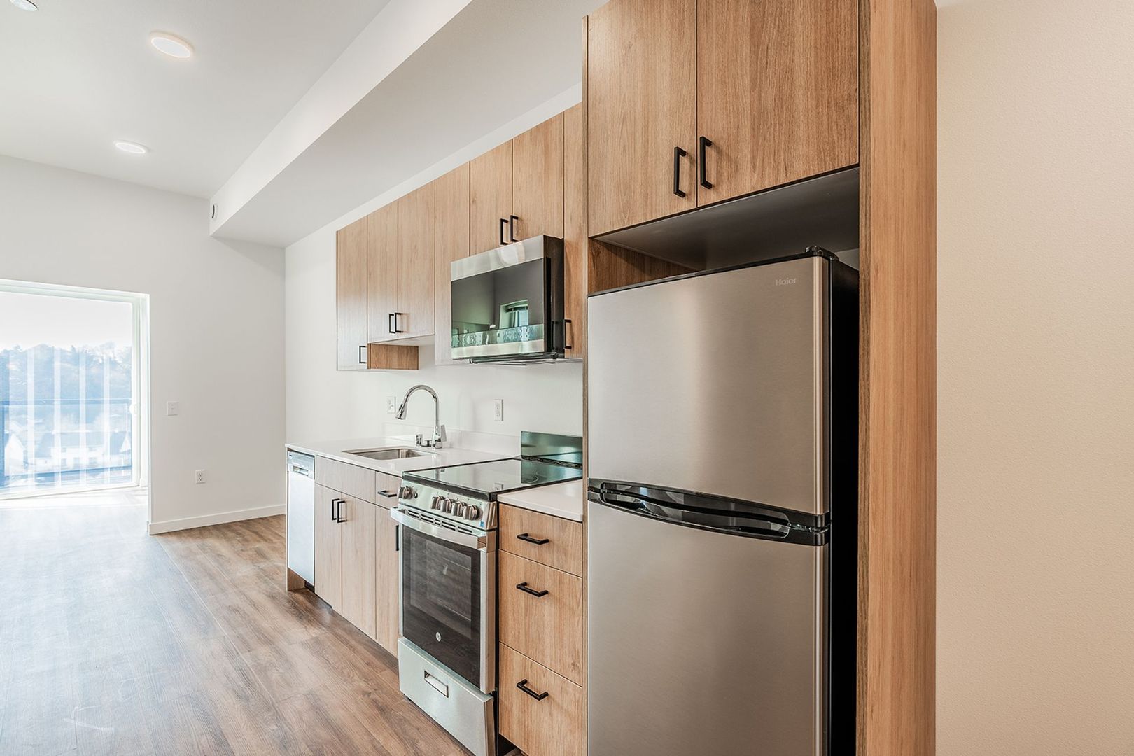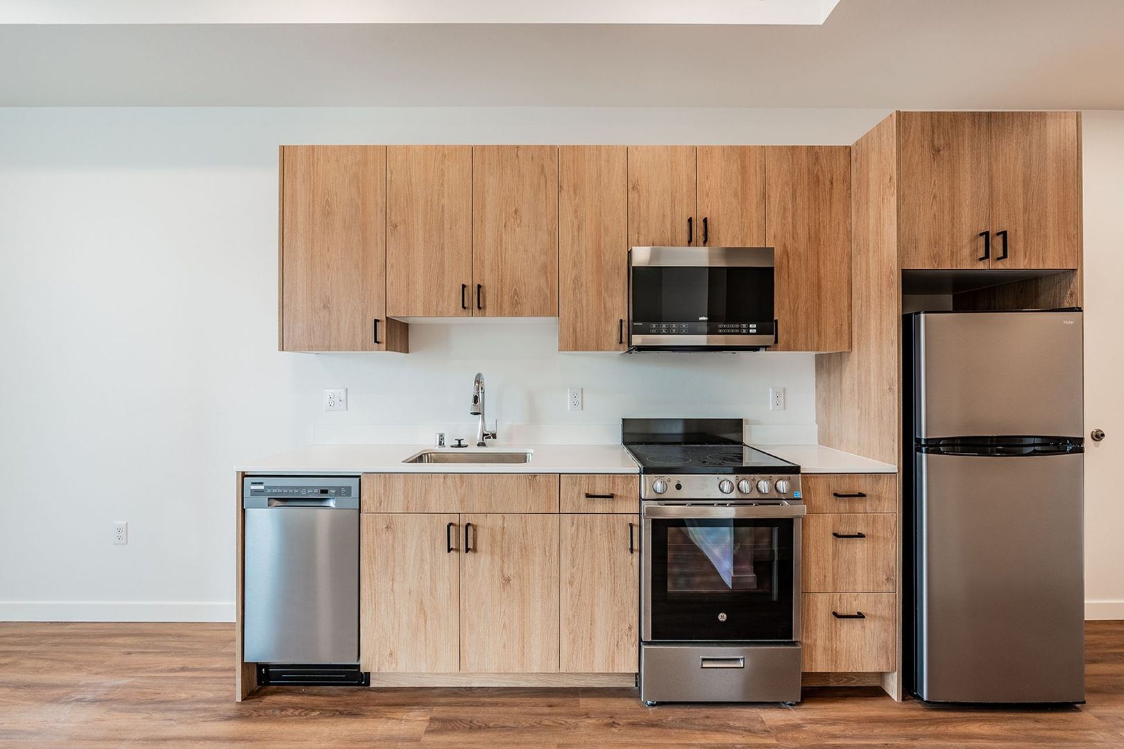 Full-size stove, dishwasher, overhead microwave, and full refrigerator