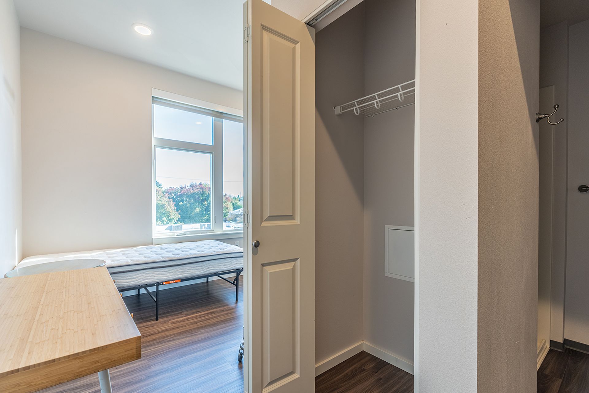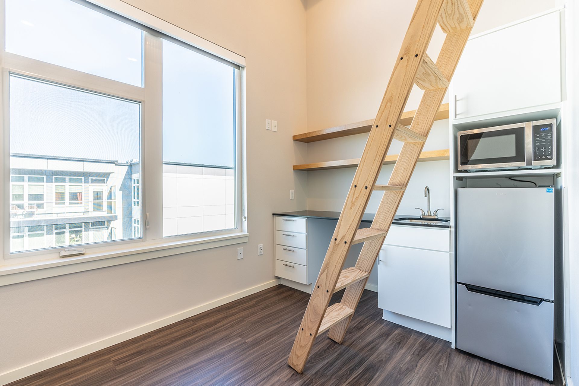 Looking for a new style, efficient, studio apartment in a fabulous location? Look no further! Ascend Apartments offers apartments perfect for minimalist living. Each unit has a large windows, a private bathroom, a built-in closet, microwave, small fridge, Wi-Fi hookups, luxury vinyl tile flooring, two sinks, and cabinet space. The building offers community kitchens with ovens and stoves, as well as complementary bike storage, a gym, laundry facilities, and community porches with grills and fireplaces.