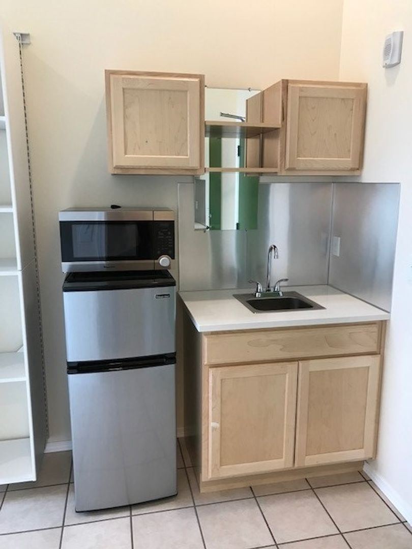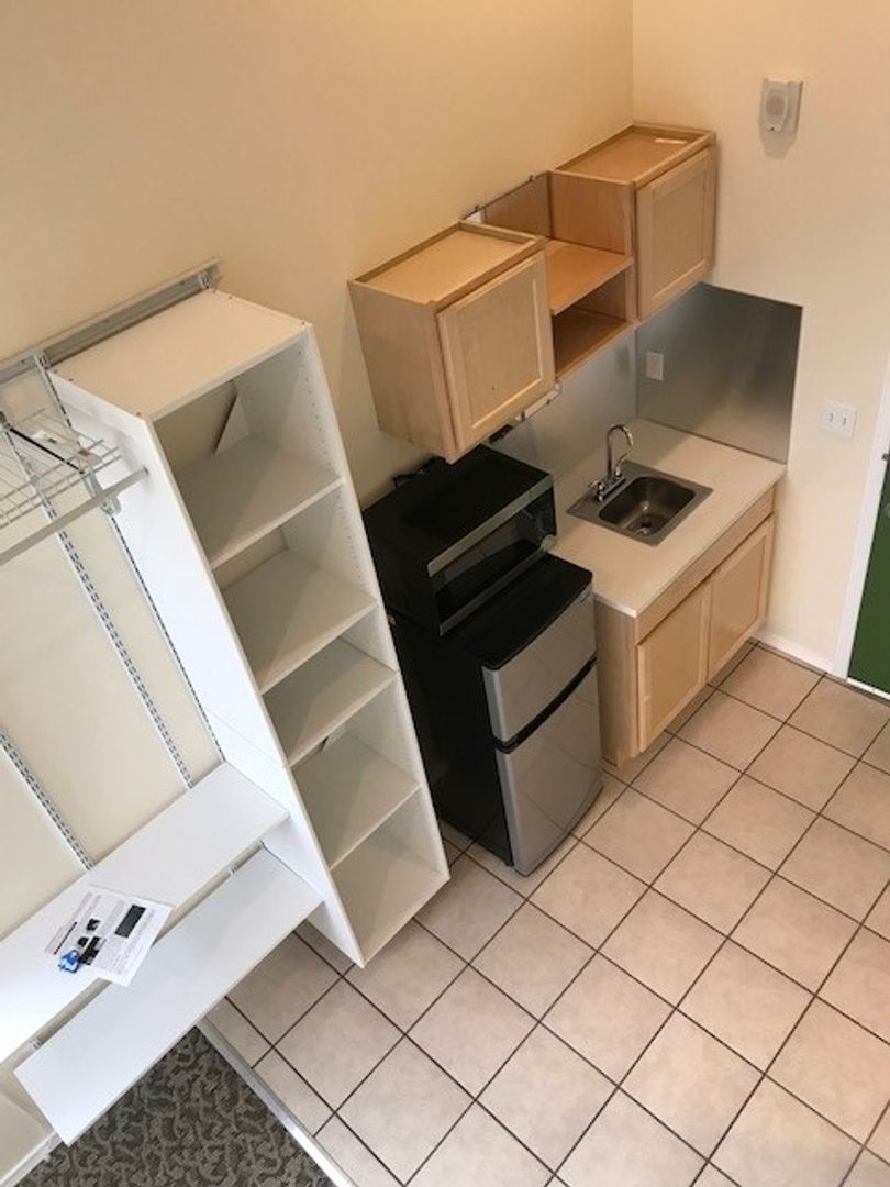 Thoughtful Pod Features: Each suite includes essentials like a kitchenette with white-quartz counters, microwave, ¾-size fridge; built in storage with an adjustable closet organizer; and furnished with a twin bed, table & chair.