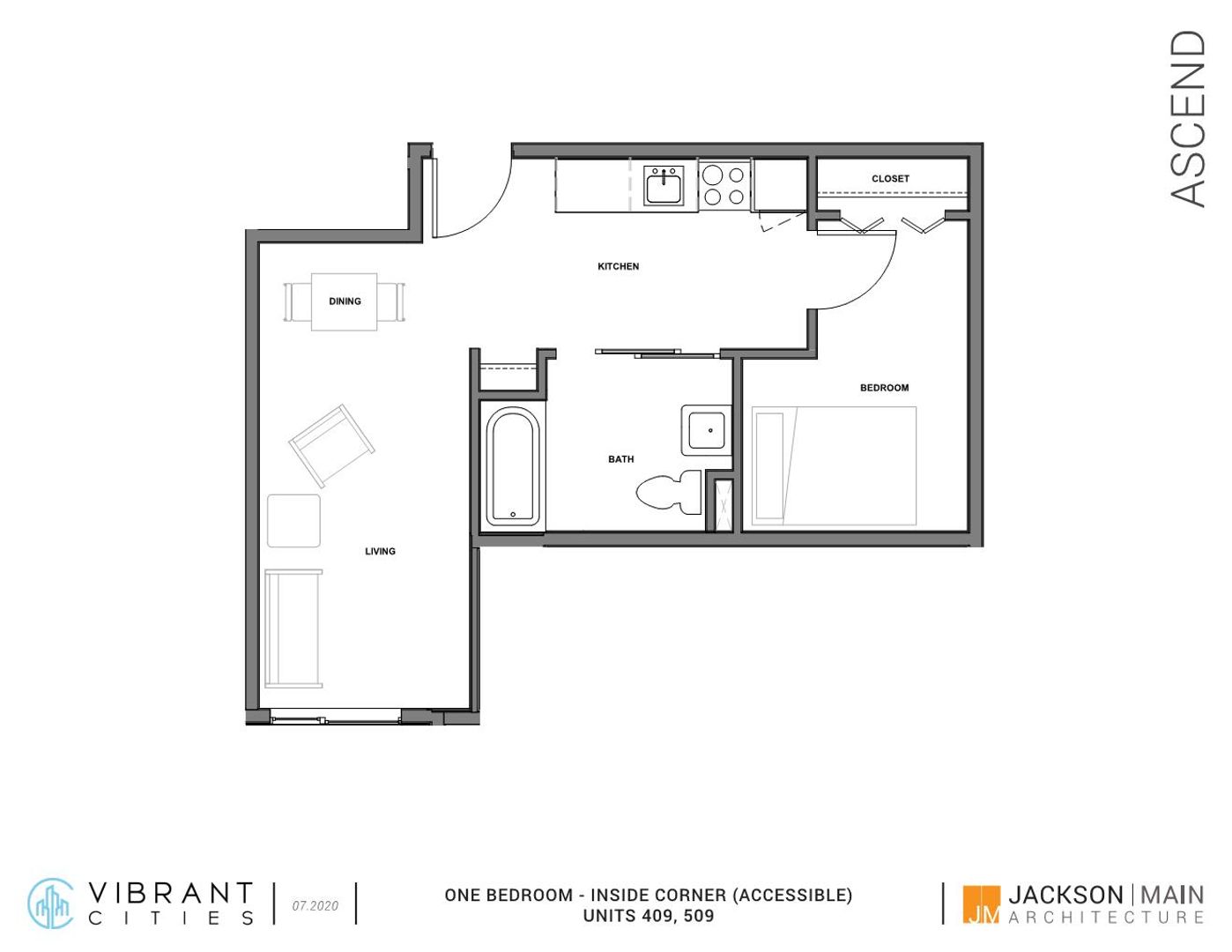 Looking for a wheelchair accessible, new style, efficient, one bedroom apartment in a fabulous location? Look no further! Ascend Apartments offers apartments perfect for minimalist living. Each unit has a large windows, a private bathroom, a built-in closet, microwave, small fridge, Wi-Fi hookups, luxury vinyl tile flooring, two sinks, and cabinet space. The building offers community kitchens with ovens and stoves, as well as complementary bike storage, a gym, laundry facilities, and community porches with grills and fireplaces.